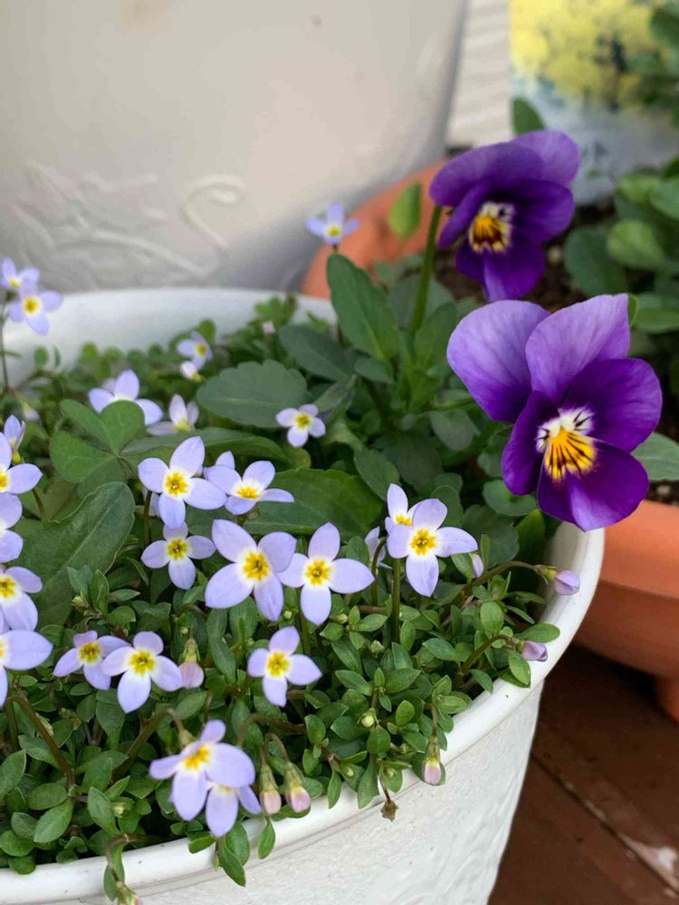 ムスカリと紫色の小花との寄せ植えにしたので白にしました😉
