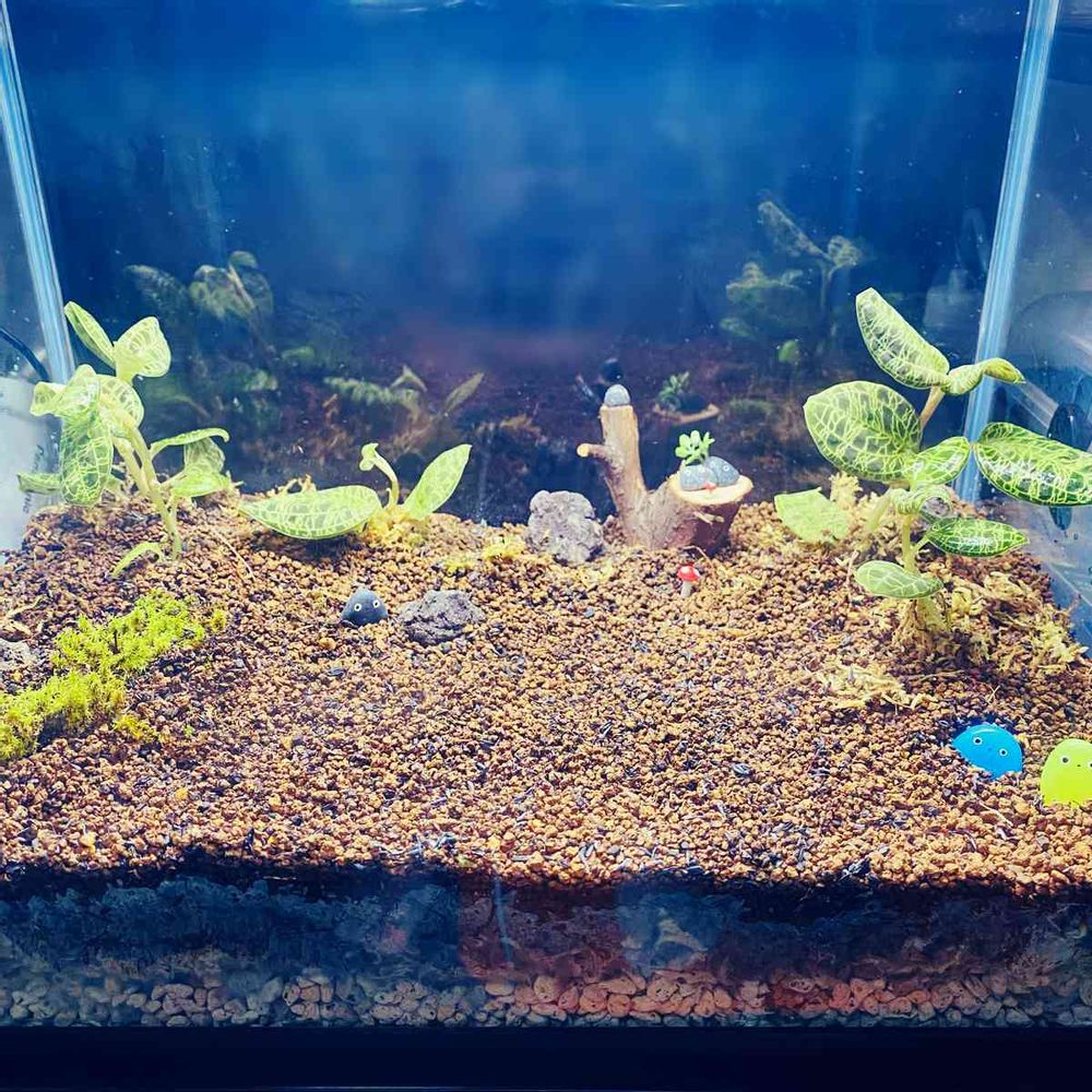 ビンにぎゅうぎゅうだったジュエルオーキッドを水槽に植え替えた!苔も買って少し入れました🍃どんどん増えたらいいなー