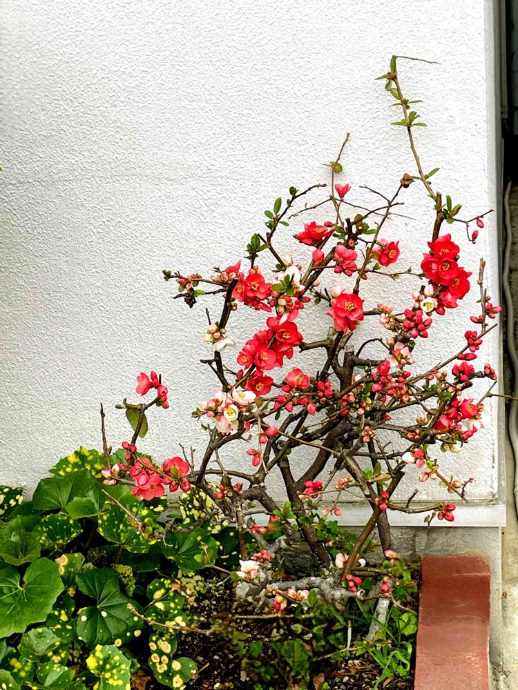 通り道のお宅の花壇に紅白の木瓜の花が、咲いていました。