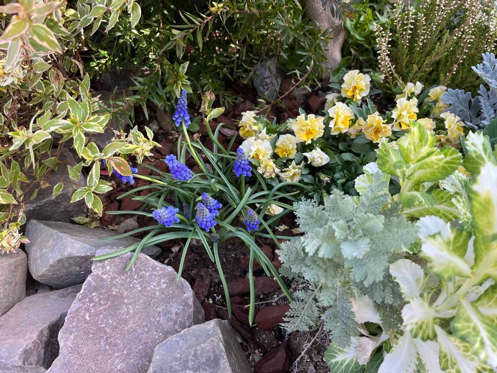 ムスカリ綺麗❣️なのに前列のハボタンが伸びまくってきたので隠れてしまう…配置ミスだね🥲ガーデニングは奥が深い😂
