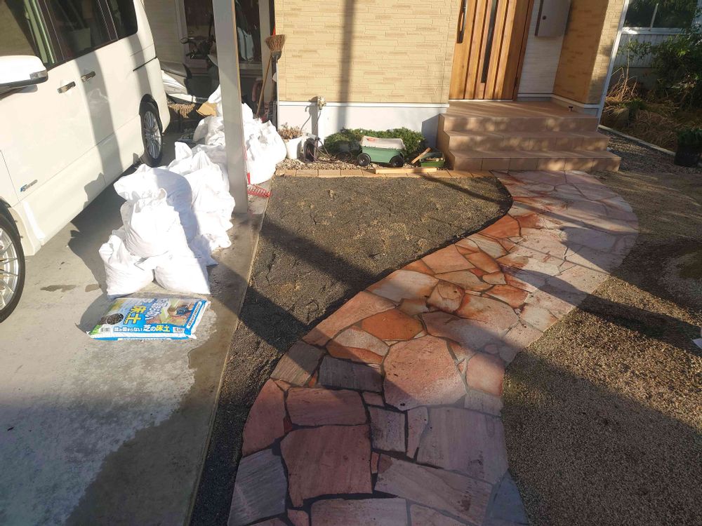 写真左の土のう袋は掘り起こして要らなくなった真砂土や砕石です。苦労の証です✨