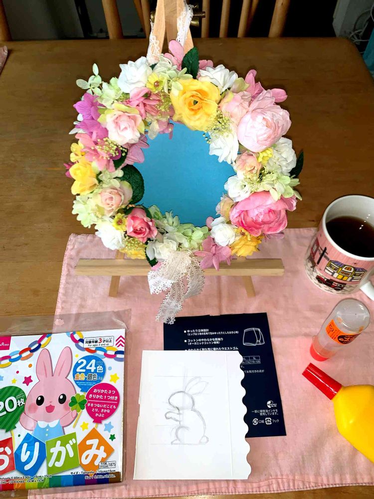 イースターは4月9日なので、せっかくならばフラワーリースだけでは無くイースターディスプレイになるようにうさぎ🐰を飾ろうと思い付く!