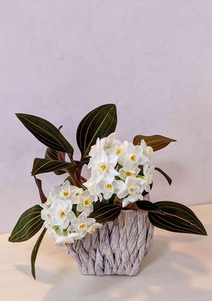 フサザキスイセン🤍まぁるく束ねて可愛いですね💗😍ホンコンシュスランの葉脈とベストマッチ😘👍 義母様と仲良く共通の趣味があると良いですね~🤗💞