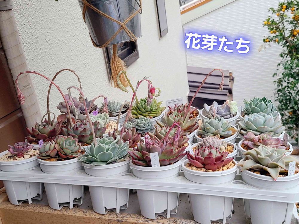 お部屋の中で冬越し中の多肉ちゃん花芽を付けてます( *´艸`)お水もまだなのに!間延びのお子ちゃま達でいっぱいよ🤭