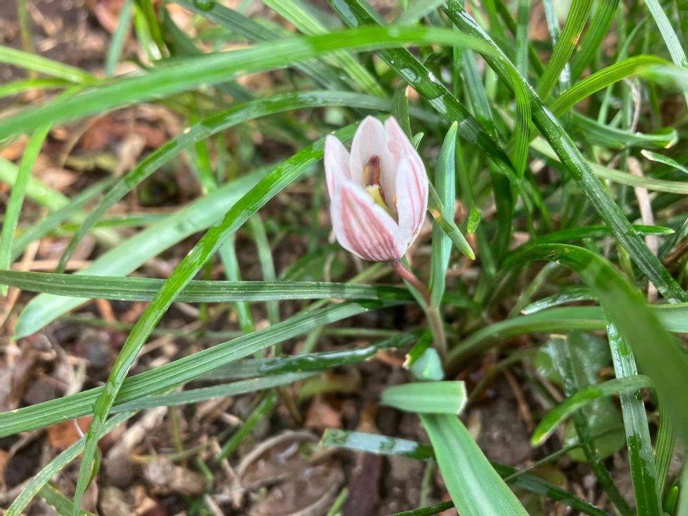 庭にたくさん葉が出てきました。根っこには小さな茶色の球根なのか大きい種なのかわかりませんがついています。お花がポツポツ咲き始めました。アマナでしょうか?