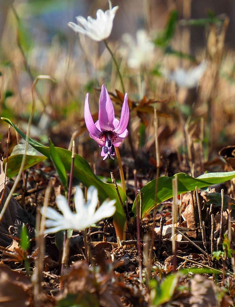 キクザキイチゲさんの群れに一人やってきたカタクリさん、