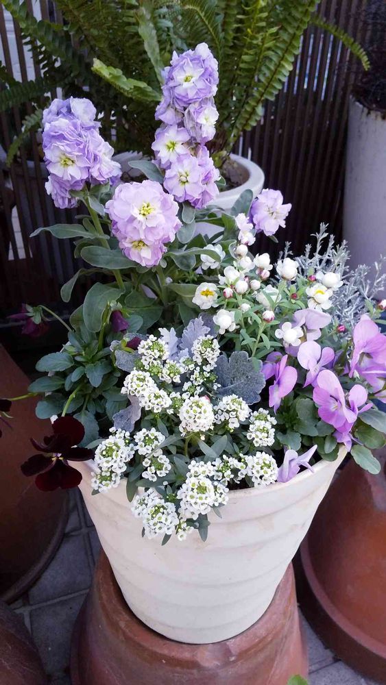 白と青紫色で統一された素敵な寄せ植え☺️🎶