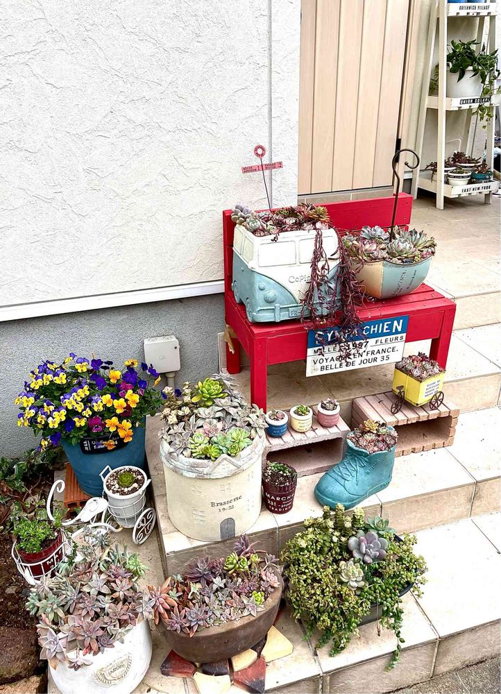 家の玄関北向きで植物を置けないので、東向き玄関の妹の家に、要らない‥‥増えすぎた多肉達を運んでたら、妹が可愛く飾ってくれてます