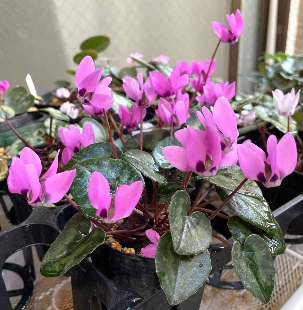 ちなみにこのスーダベリカムは手前の淡めの色のが、つるかめ山草園さんので、奥のがはら園芸さんのです。つるかめさんのは「ロゼウム(淡色)」と書かれていたんですが、想像より濃い色で咲きました。年によって色が変わるみたいですね〜