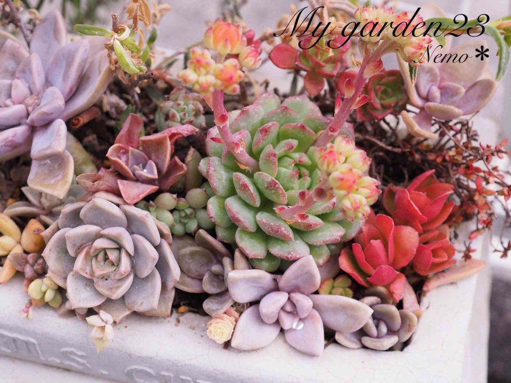 多肉の寄せ植え、お花が咲いて綺麗💕