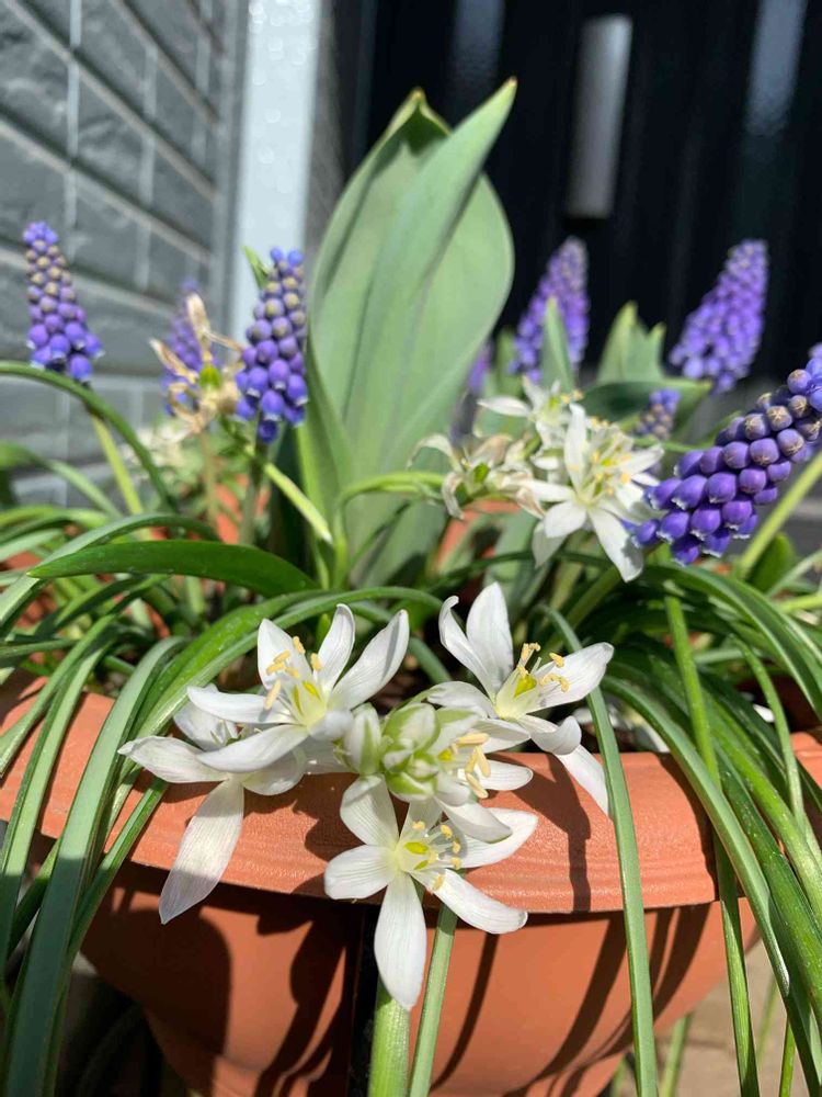 チューリップ、ムスカリ、オーニソガラムの寄せ植え🌷