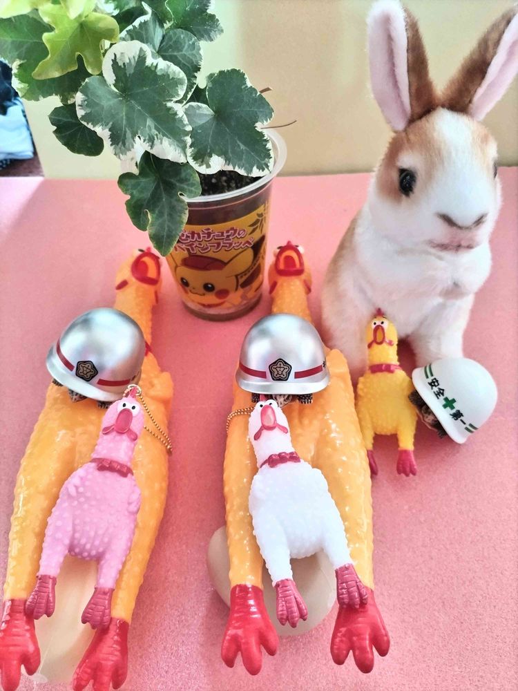 C-うさぎのぬいぐるみ、黄色いチビにぃさん、ヘルメットの亀さん