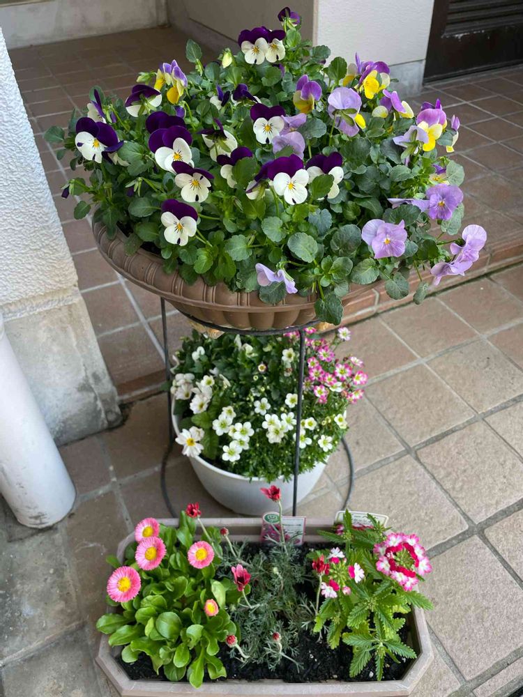 ビオラ寄植と雲間草紅白寄植とピンク軍団のデージーとローダンセマムとバーベナの寄植です💕