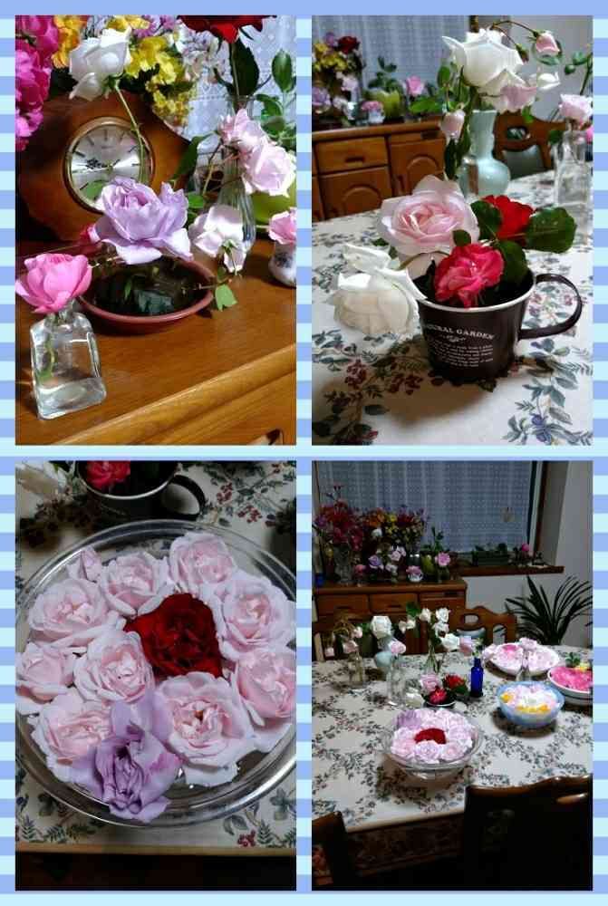 17ポットの寄せ植え、水やり、花がら摘み、畑仕事、町内のお世話になった方のお通夜に参列、大雨予報による満開バラや8分咲きのバラの花摘み、浮かべ花、無手勝流のフラワーアレンジメントでした。