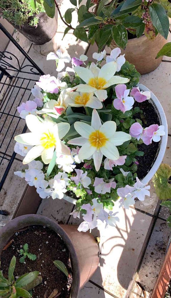 バイカラーのツボミからまさかの白いお花🌷ビックリです〜優しいお色の寄せ植え可愛いですね〜(╹◡╹)♡
