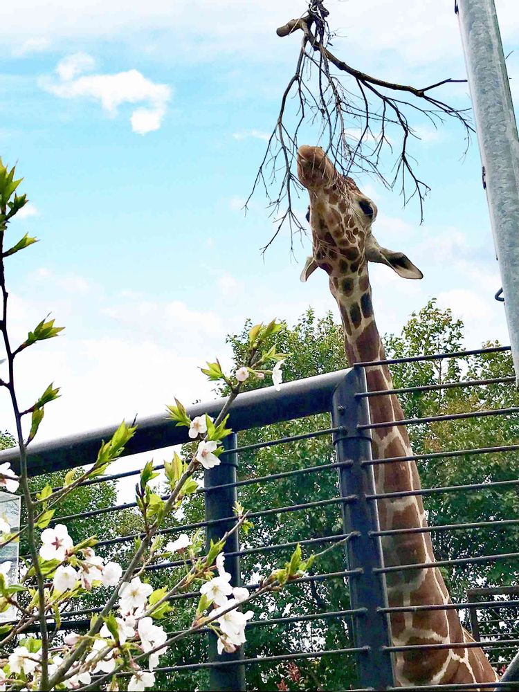 桜🌸と真っ直ぐ首を伸ばしたたキリン🦒さん、青空がバックで気持ち良いpicですね〜😃✨✨💕