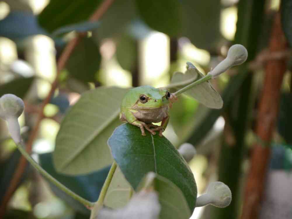 フェイジョアの蕾とカメラ目線のアマガエル。