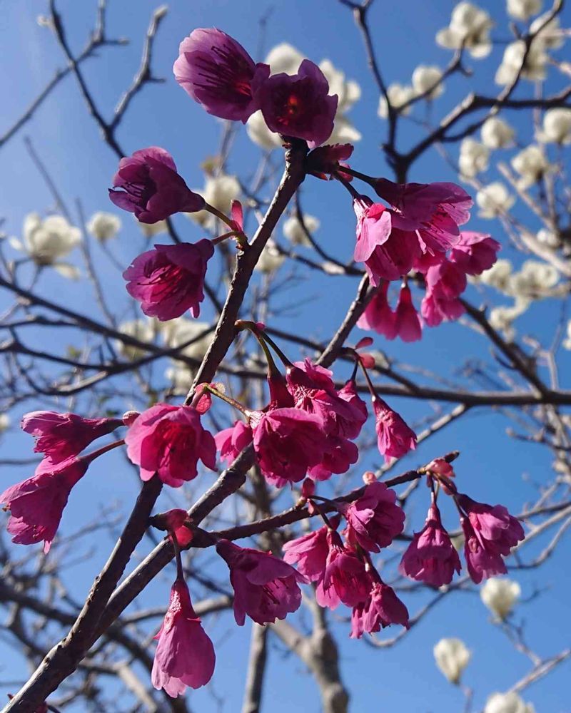 白木蓮の側で緋色の寒緋桜が