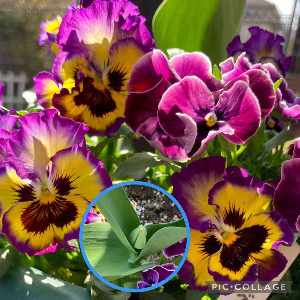 パンジーの寄せ植えの間に芽を出したチューリップの蕾 (円内)