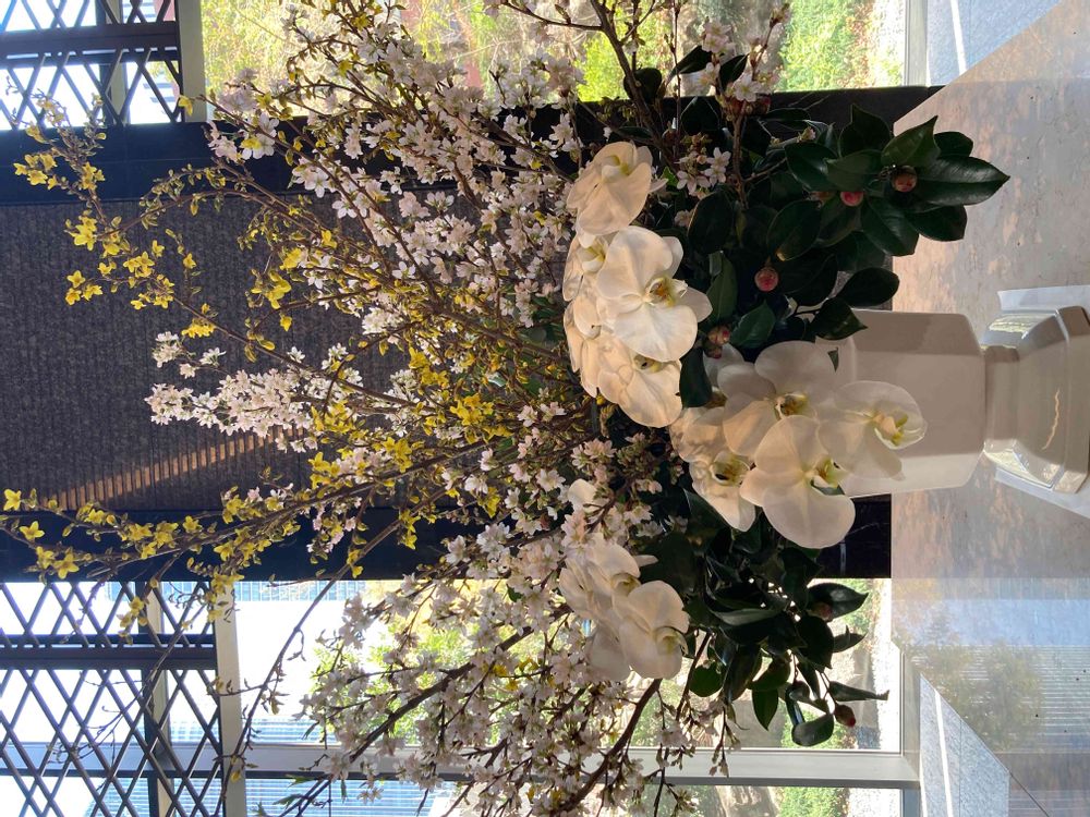 こんにちは😊コンビニ行く途中、ホテルオフィスロビーにて。コチョウラン、レンギョウ、サクラ、ツバキかな?