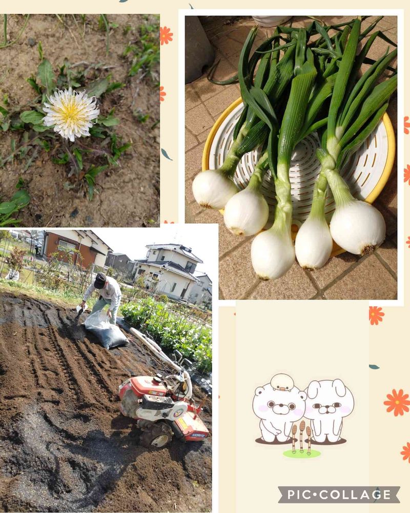こんにちわ☀️畑で今、食べてる新たまねぎです✨葉も食べれます✌️夏野菜の準備してます。耕し、籾殻燻炭、撒いてます。ふんわりなるかな?白花タンポポも咲いてます。明日からから雨☔みたい☹️です。