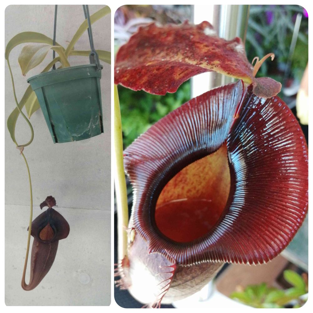 襟の部分が反らないタイプのネペンテス。赤黒くテラテラひかり…そして極めつけは🏺の中の捕虫液が粘性なので溢すと(溢しちゃった〜😖😅)トロトロ🫠でめちゃ糸引きます。