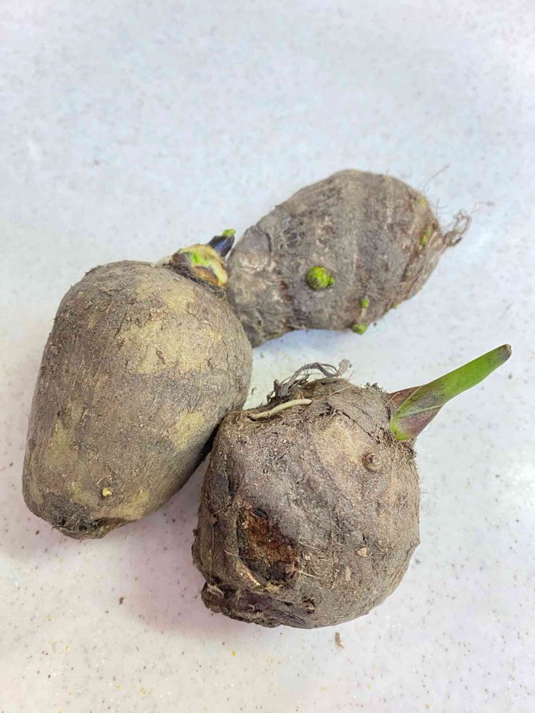 里芋はこの様に、親芋から複数の脇芽を出して成長します