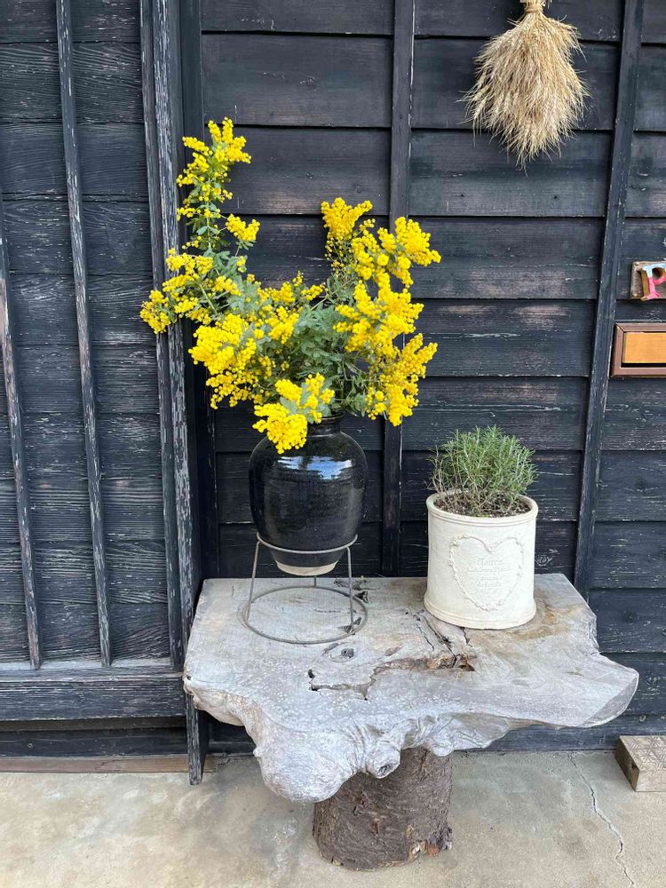 玄関前のお飾りにもミモザを飾りました