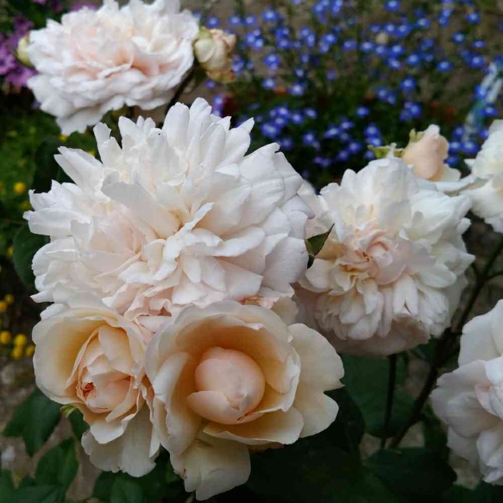 ピンクグルスアンアーヘンはバラの名前ですね。私がロベリアと言ったのは、背景にあるボケで写っているブルーの花のことです。