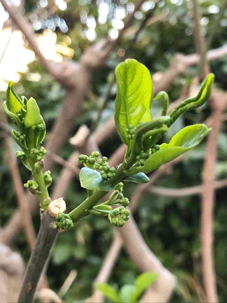 散歩道。西洋マユミの新芽が出ています。