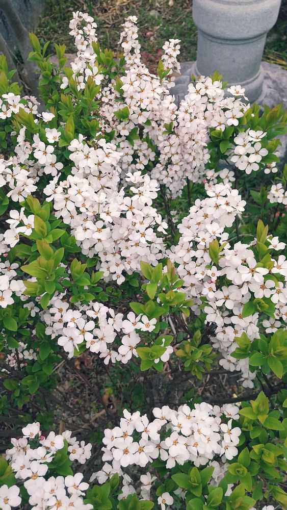 立派な灯籠の足元にユキヤナギさん綺麗✨