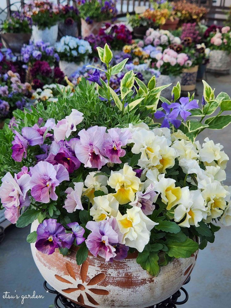 Etsuさんのツルニチニチソウ,モクビャッコウ,パンジー シエルブリエの投稿画像