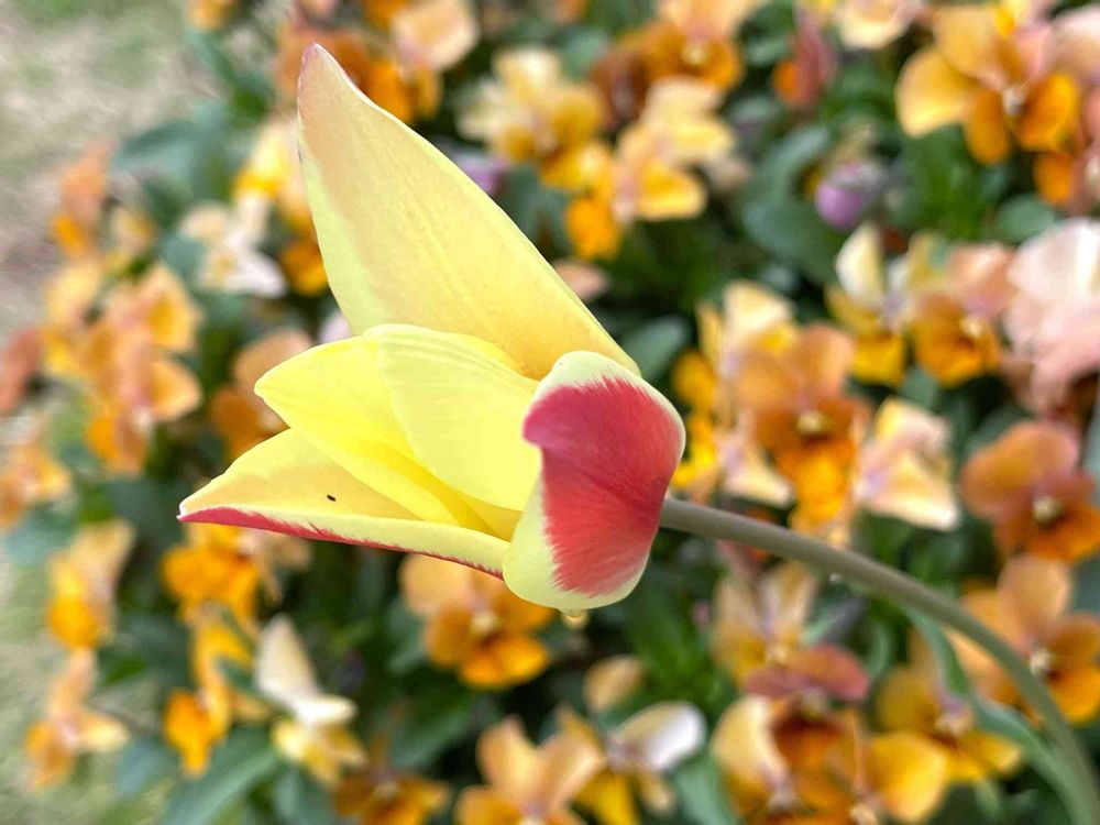 この写真では、わかりにくいのですが、アンティークビオラの鉢から、すっと伸びているチューリップなのです🌷💕