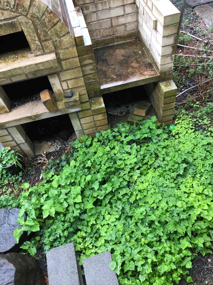 レンガの造作物は、ピザ窯と、ベーコン用のスモークの炉なのです。