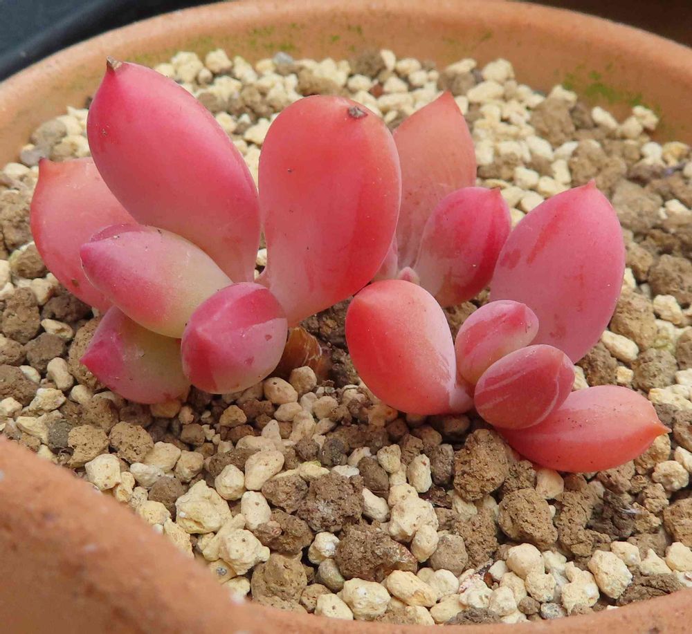 春になってもどんどん赤みを増している正体不明の葉挿しの多肉。うちにいる多肉には違いないけど,何の葉挿しかわからないまま。パキベリアっぽい。