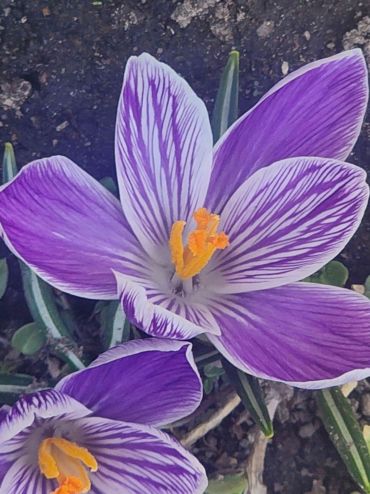 カチコチ花壇のクロッカスなんですが、こういう紫と白のストライプも良いな😃