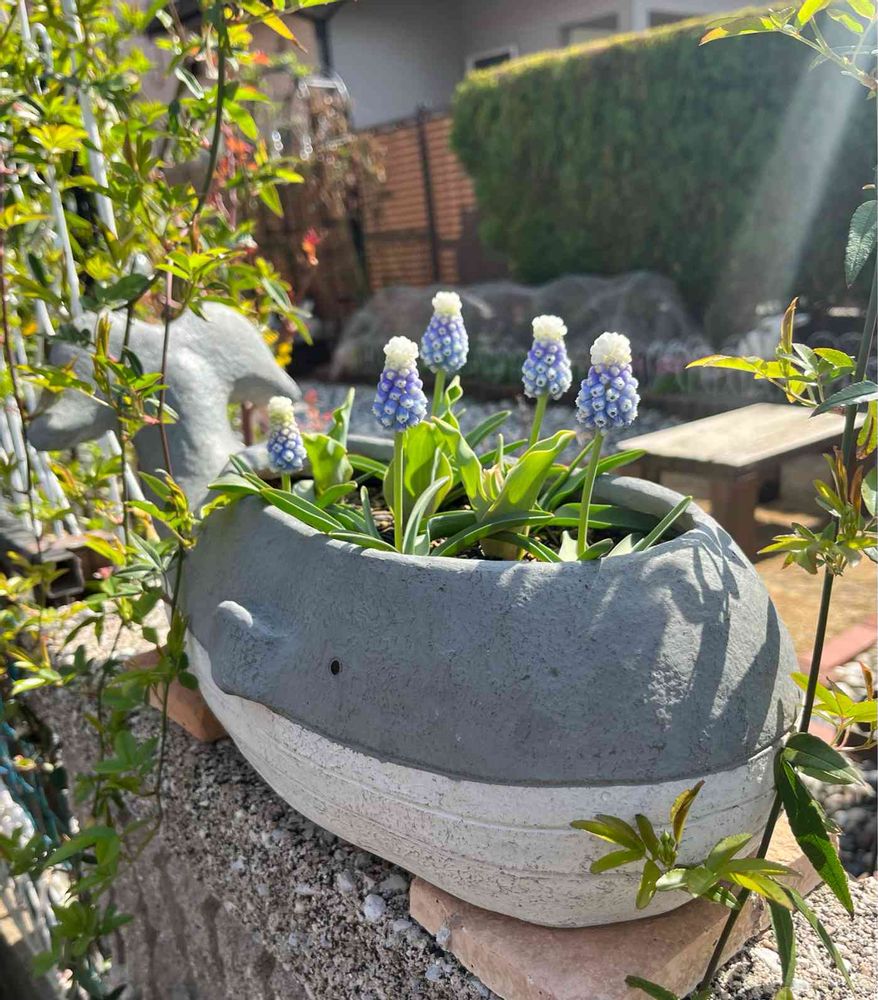 クジラが潮吹きしてるみたいで可愛い色のムスカリですね🥰クジラの植木鉢可愛い💕