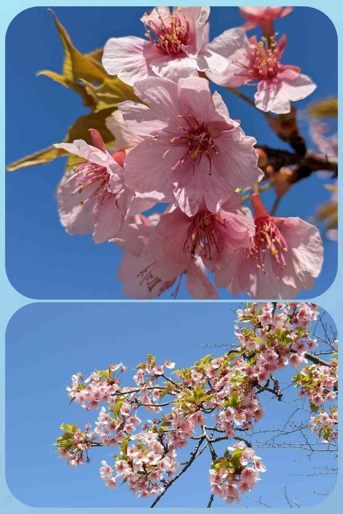 園路脇で見た❗青空をバックにイキイキと咲いていた綺麗な花🌸河津桜🌸