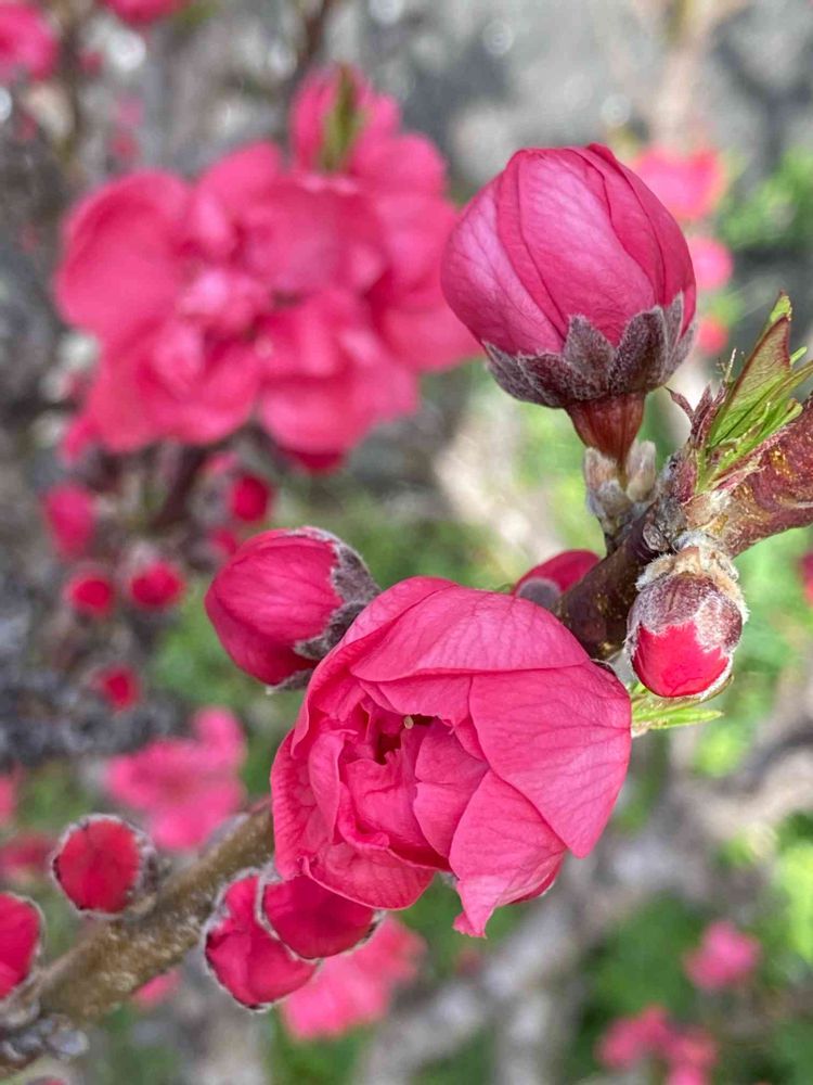 ボケ改め寒緋桃 散歩道 八重咲きの濃いピンクです 初めて見た時はバラかと思いました 棘が無いのでボケではなかったです 早春に咲く桃でした