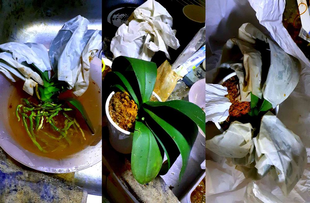 買ってきた風呂敷胡蝶蘭は、バーク植えで・・・。どうもバークは馴れないので、草木も眠る丑三つ時、家のウルサイおじさんも寝てる丑三つ時に台所で粛々と胡蝶蘭の植え替え作業・・・・。バークから水苔に切り替えて、作業終了時は、シナモンを株元にまいてミリオンAを鉢の縁の所に埋めて終了。 葉っぱに巻いてるものはお試し検証でパック。