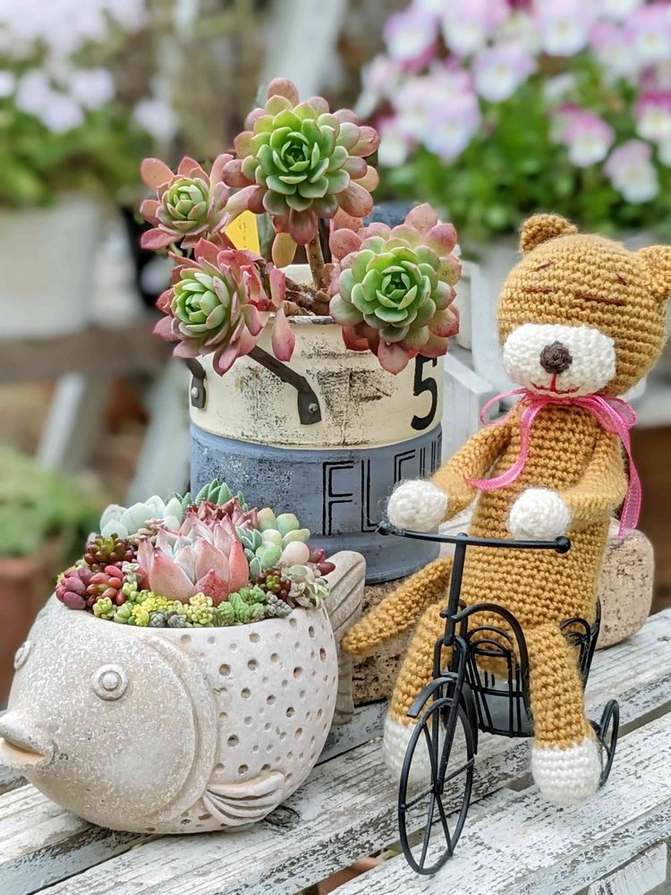 でて自転車に乗って、出かけるみたいです〜( ´∀`)ハハハ💖 トト鉢の寄せ植えも