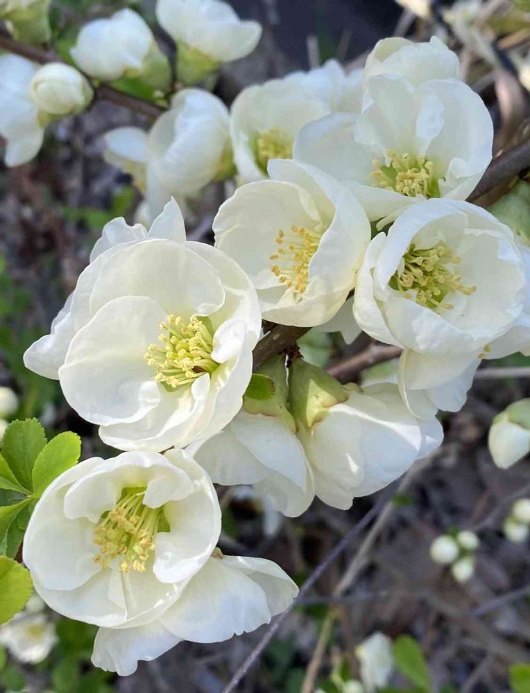 桜見物に行った帰り道、真っ白なボケのお花に出会いました🤍💚💕
