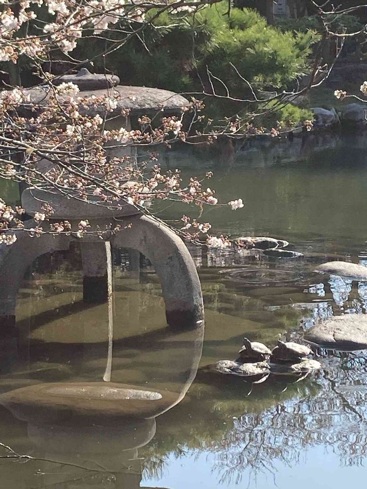 朝犬の散歩に行ったら、亀🐢さん2匹が甲羅干しをしながら花見をしてました🌸🌸