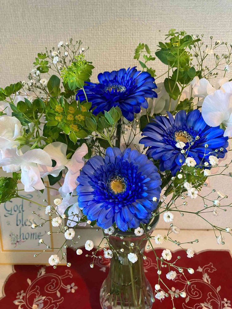 、最近ブルーの花に目がいき、ブルーのガーベラに迷わず決めました💙💙