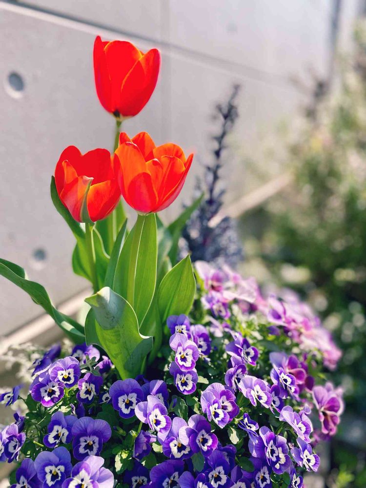 ビオラの寄せ植えに仕込んだチューリップの球根が開花!