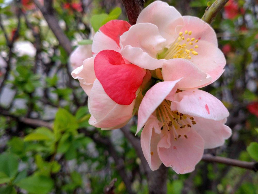 源平咲きのボケの花かも…~また…グーグル先生に聞いてみて…ねぇ…🤗🙆🏻🎶💞