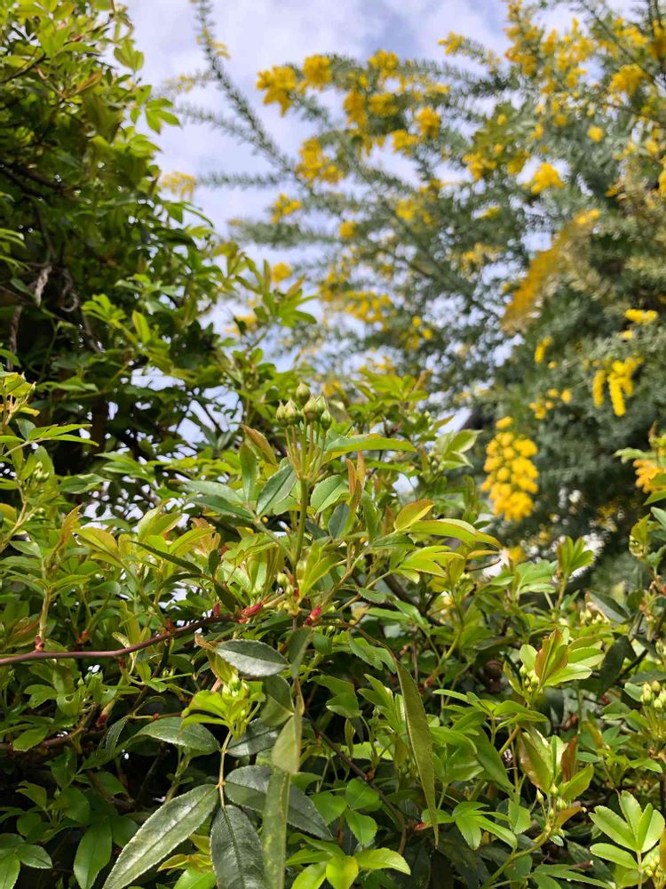 ミモザをバックに木香薔薇の花芽と新葉が一気に増えました🤗