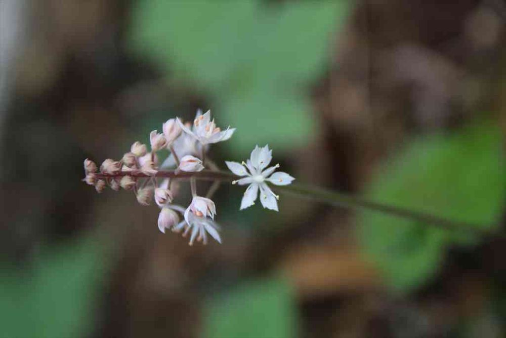 半日陰の山野草コーナーで、ティアレラの花が咲き出しました。まだ貧弱だけれど、花穂が素敵な花です。