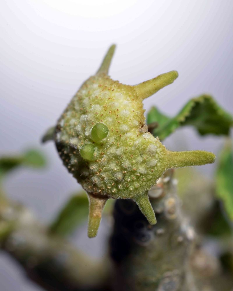 ドルステニア・sp.の奇妙な花。真ん中に二つ、プクリと膨れているのが自家受粉した種です。このあと種がはじけて飛んでいくのですが、我が家では種を巻き散らされる前に花をむしり取っています。