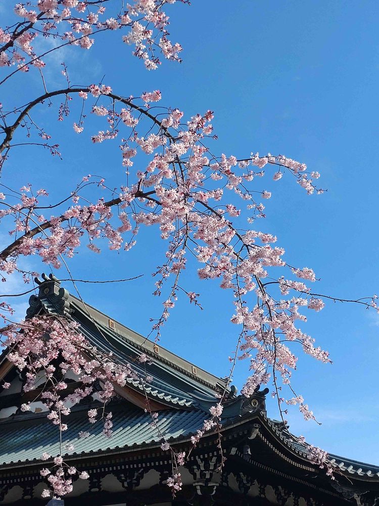 空の青、お寺の屋根、枝垂れ桜 そうそうpちゃんの腕前 みんな揃って、素敵な写真になったね🤗